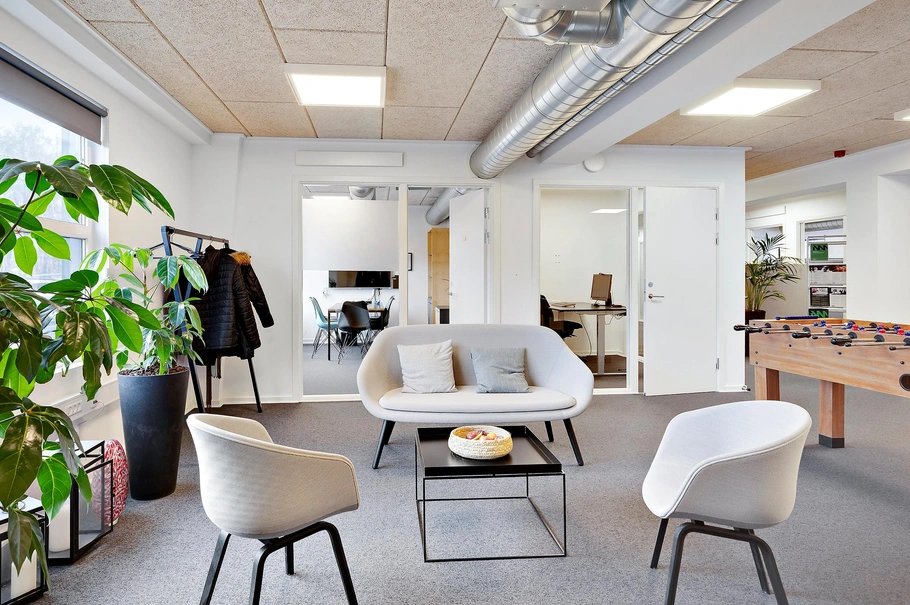 De 462 m² er beliggende i stueplan med godt lysindfald. Er indrettet med reception, 8 kontorer/mødelokaler i forskellige størrelser. Flere af væggene er af glas, hvilket giver et lyst og åbent arbejdsmiljø.