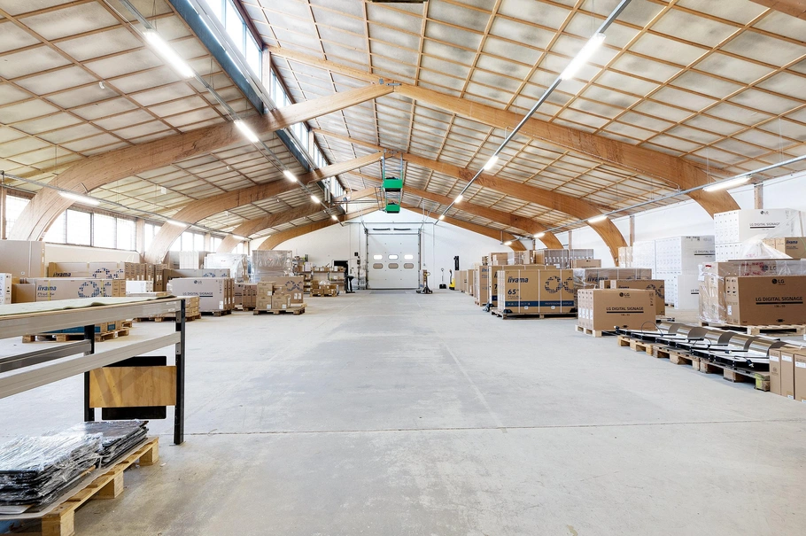 En stor el-ledhejseport i gavlen giver niveaufri adgang til lejemålet. Her giver den særlige tagkonstruktion, med forskudte tagflader over limtræsspærerne, en lang række loftsvinduer med ovenlys, ligesom et vinduesbånd i hallens vestvendte side også bidrager til masser af dagslys. Lofterne giver desuden en behagelig akustik i hallen, hvor der også er installeret trykluft. Væggene er malet hvide indenfor det sidste år.