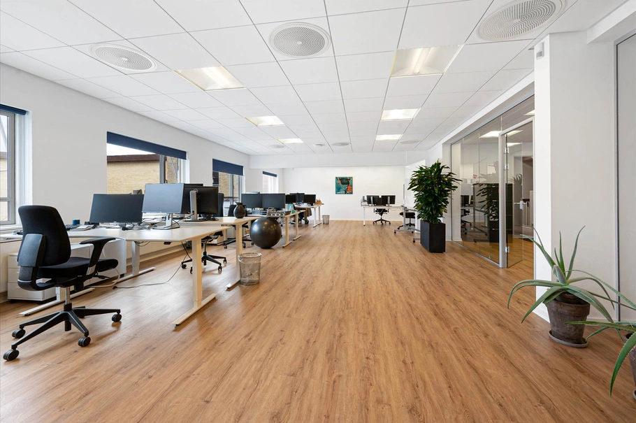 Ejendommens moderne faciliteter er kombineret med lyst trægulv og et flot lysindfald, som er med til at understøtte en behagelig atmosfære for både medarbejdere og kunder.