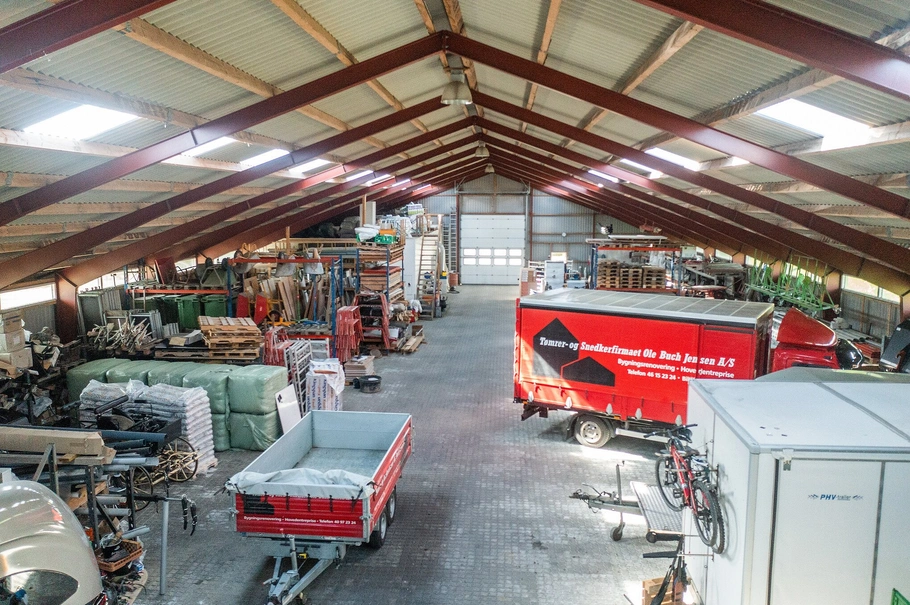 Lagerhallen har en god loftshøjde, og har tidligere været brugt til general opbevaring, samt parkering af køretøjer brugt på ejendommen.