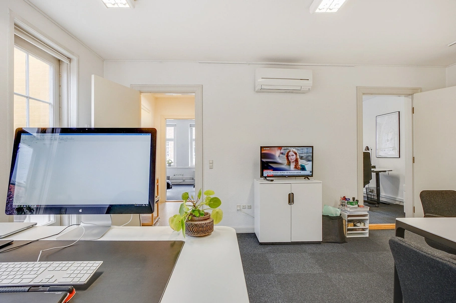 Dette kontorlejemål på 1. sal byder på en lys og indbydende atmosfære takket være fire store vinduer mod gaden, der sikrer et naturligt og behageligt lysindfald. Lejemålet er funktionelt indrettet med tre rummelige kontorer, hvoraf det ene let kan anvendes som mødelokale.
