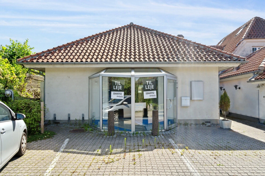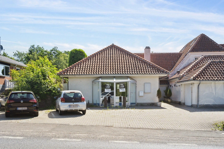 Så er det muligt at leje en tidligere tandlægeklinik på 152 m², som er opført i hvidpudset mursten med tegltag. Lejemålet indeholder: Reception med venterum og kundetoilet, 3 gode klinikrum/kontorer, teknikrum/printerrum, bagindgang samt stort lyst køkken/alrum, som let kunne anvendes til behandlerrum/showroom. Ejendommen fremstår yderst charmerende og har en markant og synlig beliggenhed. Til lejemålet hører 3 parkeringspladser.