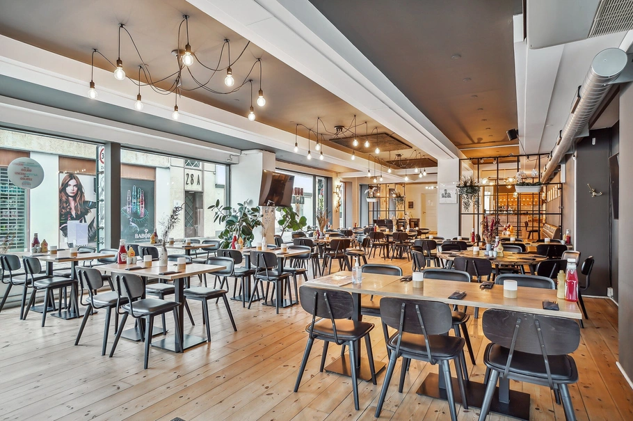 Lejemålet er i dag indrettet med et hyggeligt spiseområde mod de store vinduer, to kundetoiletter samt nyere køkken.