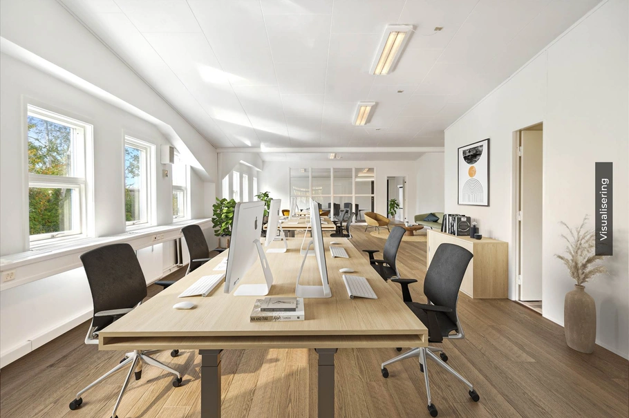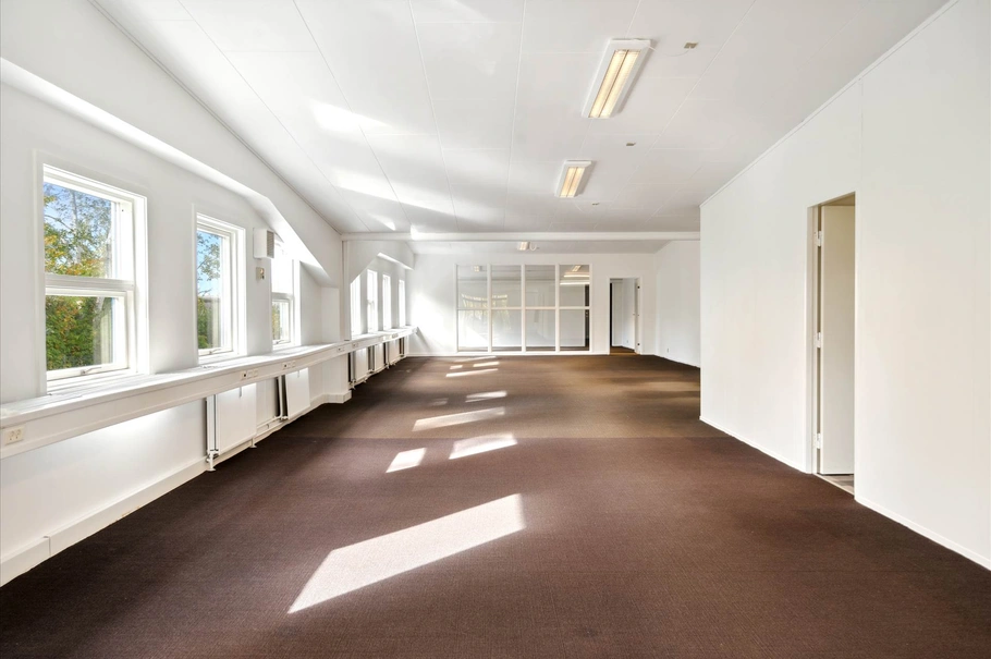 Det ene kontorlejemål er på 242 m² og er beliggende på ejendommens 1. sal. Det ligger i den stille ende af grunden og der er gode parkeringsforhold til personbiler. Lejemålet består af et storrumskontor med højt til loftet, samt et dejligt mødelokale, et tekøkken og et toilet.