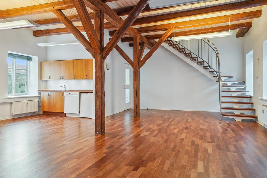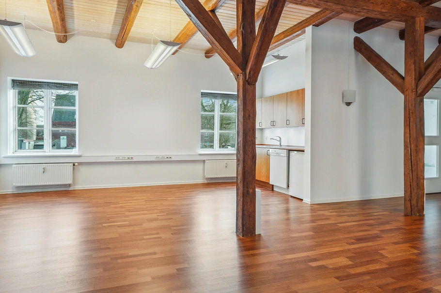 Inde i lejemålet møder du et flot åbent kontormiljø med synlige bjælker. Der er trappe til 2. sal, åbent køkken samt et depotrum. Når du tager den åbne trappe op til lejemålets 2. sal kommer du ind i et hyggeligt kontor/mødelokale med skrå vægge, synlige spær og et godt lysindfald fra tagvinduerne.
