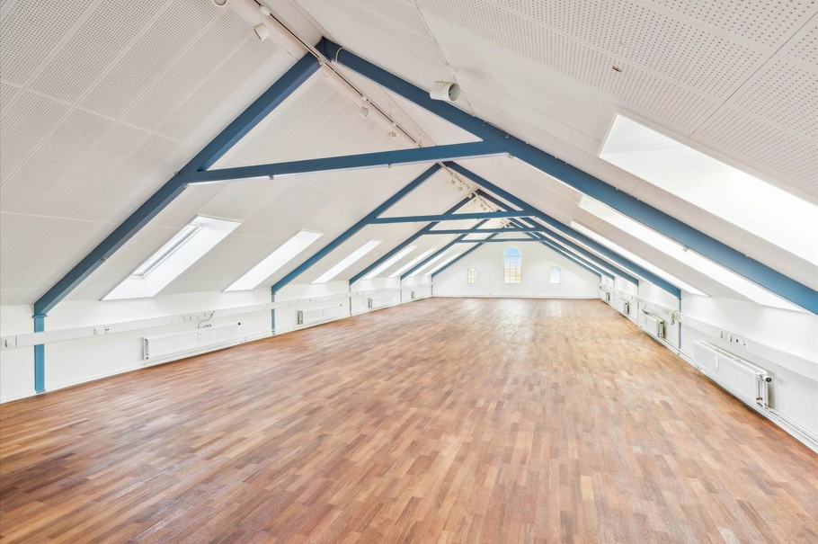 Velkommen til dette charmerende kontorlejemål, som byder på en helt særlig atmosfære med synlige bjælker og moderne akustiklofter. Lokalet er indrettet med et rummeligt storrumskontor, hvorfra der er en fantastisk udsigt over byens tage og et skønt naturligt lysindfald, som skaber et inspirerende arbejdsmiljø.