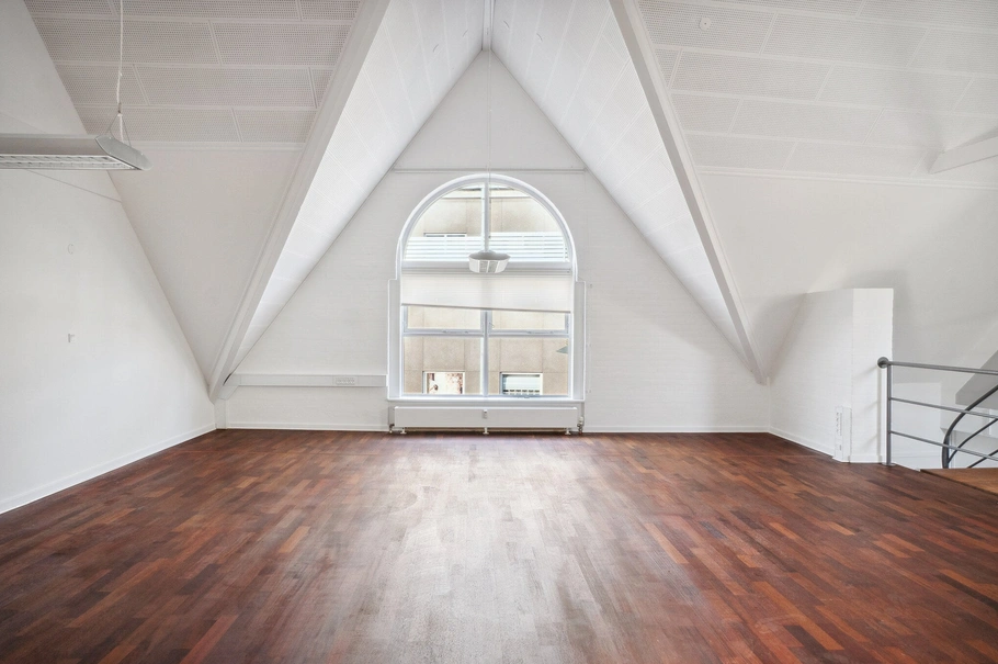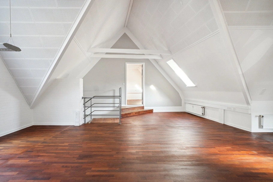 Når du kommer ind i lejemålet møder du et flot kontormiljø med skrå vægge og synlige spær. Der er yderligere et mødelokale/kontor samt en længere gang med 4 kontorer, toilet samt en god frokoststue.