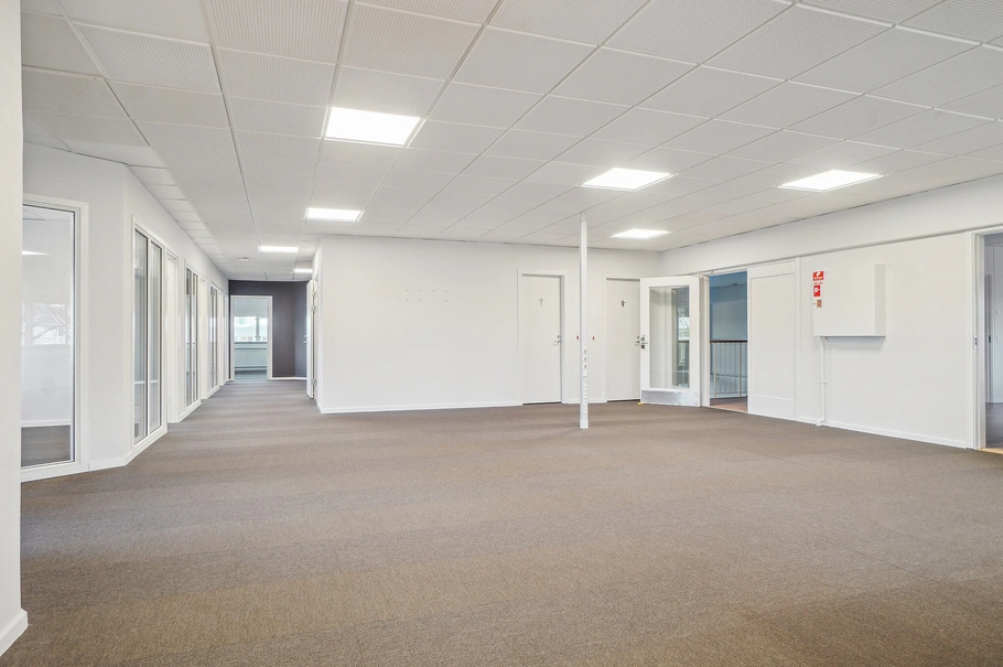 Ejendommen byder på veludnyttede kontorarealer fordelt over to etager med fleksible kontorløsninger i forskellige størrelser. Flere kontorer har glasvægge, der skaber et lyst og åbent arbejdsmiljø, mens nogle har trægulv og andre gulvtæppe. To trapper forbinder etagerne, hvilket fremmer en god intern sammenhæng. Lejemålet inkluderer mødelokaler, en kantine og flere toiletter på begge etager. Der er fibernet og 1. sal har LED-belysning, som understøtter en effektiv arbejdsdag. De indbydende fællesfaciliteter og det imponerende indgangsparti skaber et professionelt indtryk for både medarbejdere og besøgende.