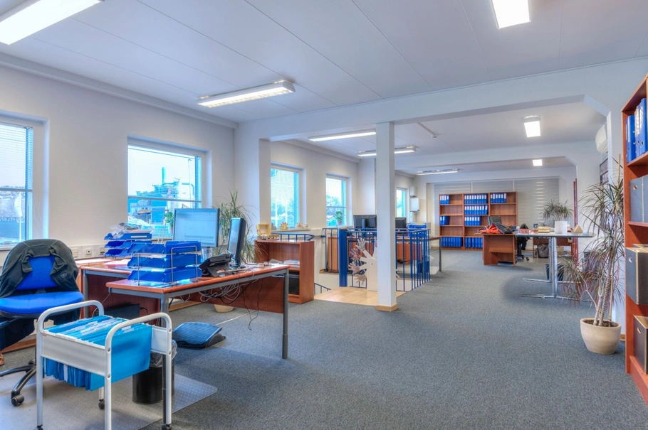 Pænt glasdørsparti, der giver adgang til hallen, hvoraf den første del pt. er indrettet til åbent kontorareal med 2 fine glaskontorer. Dette areal kan dog nedlægges, så der skabes mere lagerplads. Denne del af lejemålet er belagt med tæpper. Videre adgang til højloftet og meget lys lagerdel. Der er vinduer i både mur samt ovenlysvinduer. Adgang til mindre rum, der kan anvendes til f.eks. teknik eller værksted.