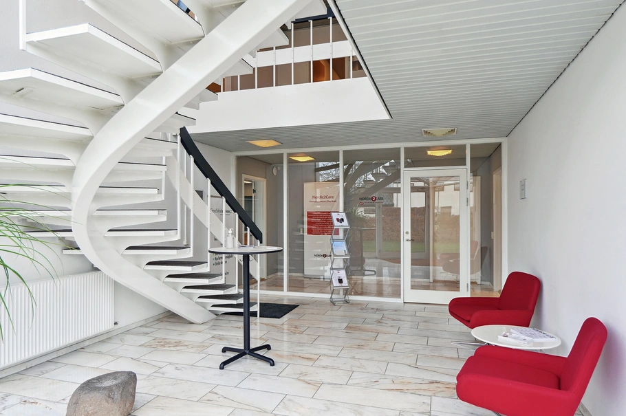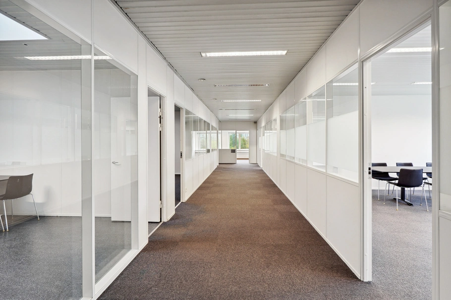 Kontor: Kontoret er funktionelt indrettet med en fordelingsgang og opdelt med 8 kontorer og mødelokaler i forskellige størrelser. Glasvægge adskiller kontorerne og gangarealet, hvilket skaber et lyst og åbent arbejdsmiljø.