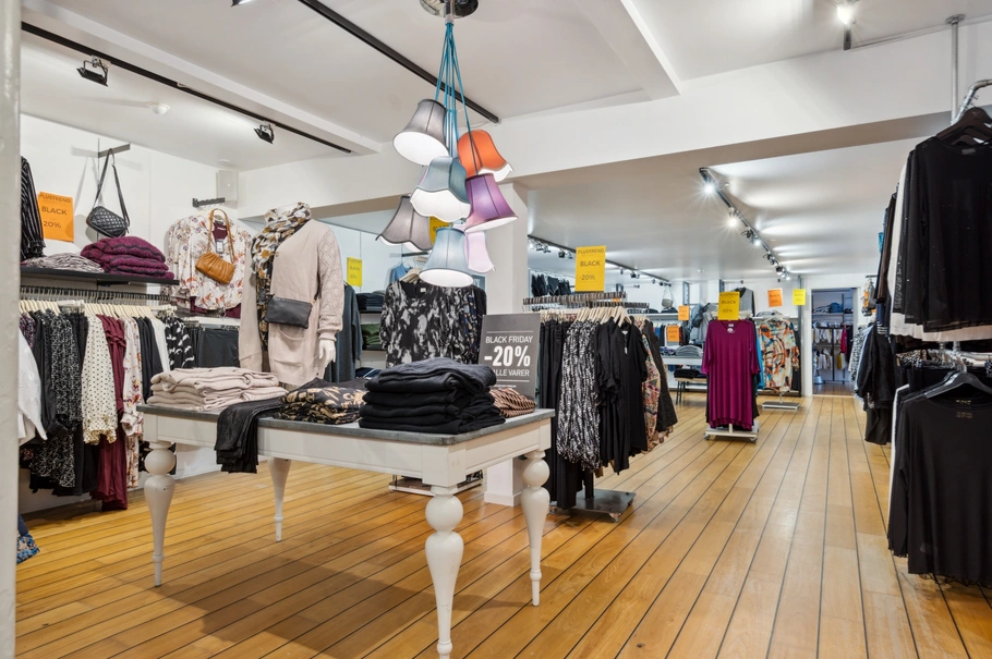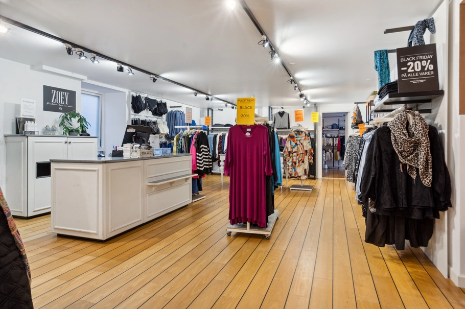 Butikslokale: Et stort, regulært salgsareal opdelt med en skillevæg, der kan anvendes til kontor eller lager efter behov.