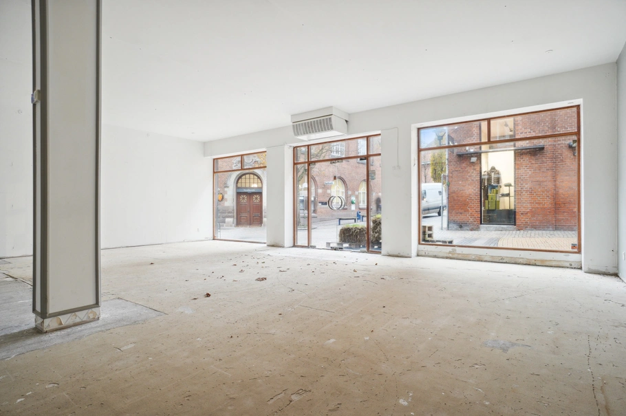 Der er 5 store facadevinduer til udstilling og indgang ad glasdør. Lejemålet består af 2 store regulære lokaler. Bagerst i lokalerne er der ligeledes vinduer, så der kommer lys ind fra begge ender af lokalerne og giver et godt lysindfald.