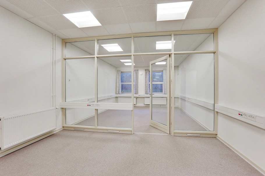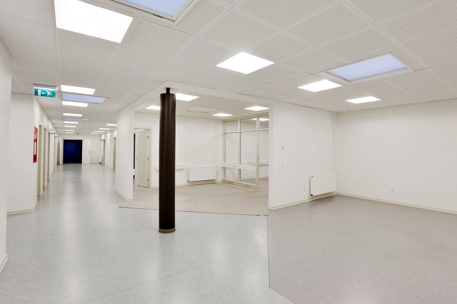 Kontorlokalerne fremstår delvist med tæppefliser og delvist med linoleumsgulv.