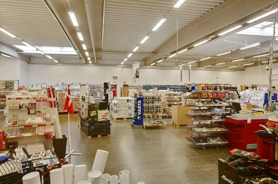 Butikken udgør et samlet areal på 878 kvm og har fra ejendommens opførsel i 2007 været anvendt til kontorforsyningsforretning – og er anvendelig til mange former for butiksudstilling, engrossalg, kombineret showroom/lager m.m.