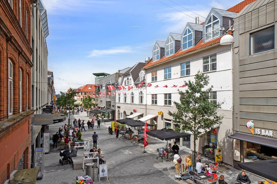 Overalt i lejemålet er der et særdeles godt lysindfald grundet flere karnapper og de mange meter facade, hvilket tillige giver et spændende og storslået udkik over hele Torvet og gågaden med alle dens aktiviteter og cafeliv m.v.