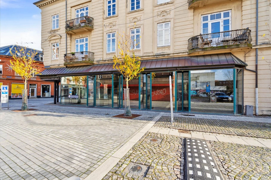 På attraktiv hjørneplacering i gågaden udlejes flot højloftet butik på 216 m² med 120 m² god kælder.
