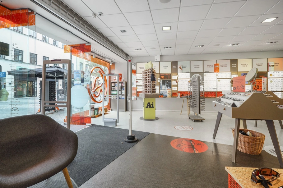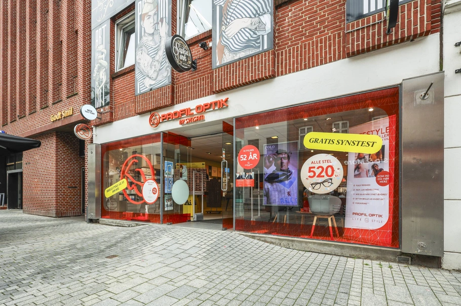 Lejemålet er tidligere benyttet af Profil Optik og er indrettet med store facadevinduer, som giver god eksponering til forbipasserende. Indretningen - som i øvrigt er fleksibel - består aktuelt af et rummeligt salgslokale, to kontorer, et toilet og et personalerum. Udover de 134 m2 i stueplan hører der til lejemålet 50 m2 lager i kælder.