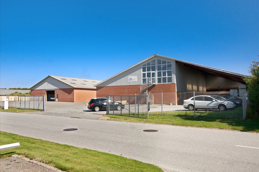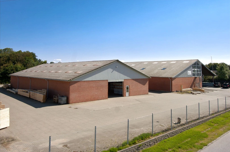 Den i alt 6.921 m2 store grund deles med ca 1.821 m2 til 2 parcelhuse og ca 5.100 m2 indhegnet og befæstet grundareal , der hører til 2 sammenhængende haller, der er opført i røde teglsten/eternittag/ovenlys og rumbelysning og hvor ejer benytter den ene til sin virksomhed. En del af arealet er et stort overdækket af- og pålæsningsareal i gavlen, der nemt vil kunne inddrages til produktion/lager.
