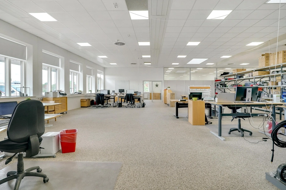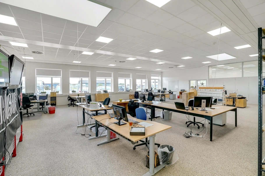 120 m² kontor og administration med køkken, toilet, mødelokale og kontorarealer.