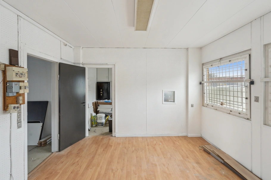 Bagved ejendommen er der stort parkeringsareal, hvor det er muligt at leje en parkeringsplads. Arealet er asfalteret og udover parkeringspladser er der plads til affaldscontainere.
