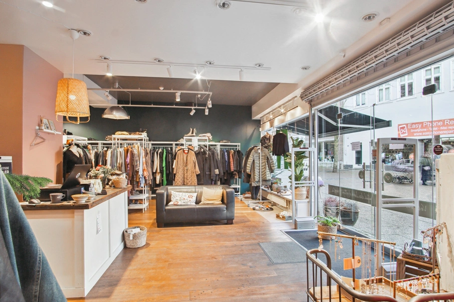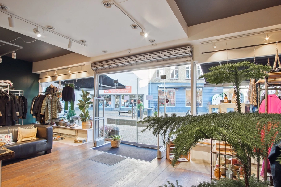 Indretningen er med indgang i niveau fra gågaden til stort, nyrenoveret butikslokale på cirka 125 m2. Butikken fremstår meget lys og med god loftshøjde. Den brede facade giver et naturligt lysindfald. Fra butikslokalet er der adgang til mindre lagerlokale, derudover også adgang til baglokale med vindfang og personaleindgang med lyst og nyrenoveret toilet og køkkenfaciliteter.
