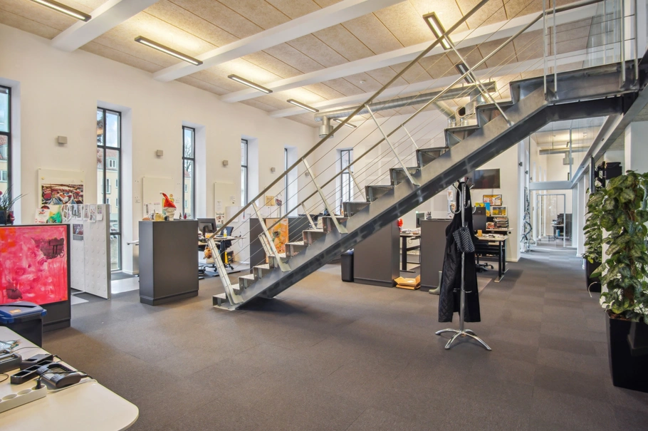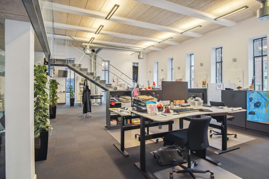 Indretningen er med adgang fra parkeringspladsen til velkomstområde, som også fungere som fordeler rum til de forskellige afdelinger. Til højre for indgangen er der kontorlokaler i forskellige størrelser, fra enkeltmandskontorer til kontorer med plads til 2-3 medarbejdere. Længere nede af fordelergangen er der køkkenområde med køkken samt spisepladser - der er tilmed terrasse, hvor husets brugere kan holde frokostpause. På venstre side af fordelerummet findes det store og utrolig flotte åbne kontorlandskab, hvor der er plads til mange medarbejdere, der er i dette rum mødelokale og kontorlokaler på repos med adgang via ståltrappe. De fleste vægge i lejemålet er af glas, hvilket giver et fantastisk miljø og fornemmelse af liv samt masser af naturligt lys.