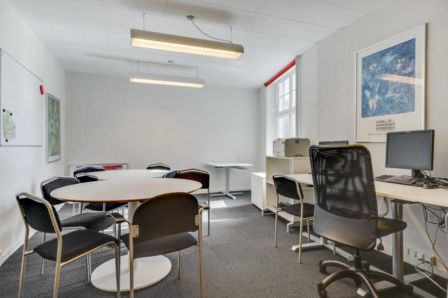 Indretningen er med gulvtæpper, hvide vægge og gode store vinduer ud mod gågaden, som giver lokalerne et godt og naturligt lysindfald.