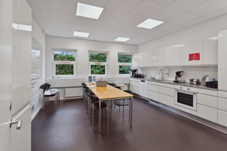 Indretningen af kontorlejemålet inkluderer forskellige områder - herunder et åbent storrumskontor, møderum til konferencer og kundemøder, samt et køkken med spiseplads. Variationen gør det ideelt til virksomheder, der har brug for forskellige arbejdsområder, og det skaber en alsidig og funktionel arbejdsplads.
