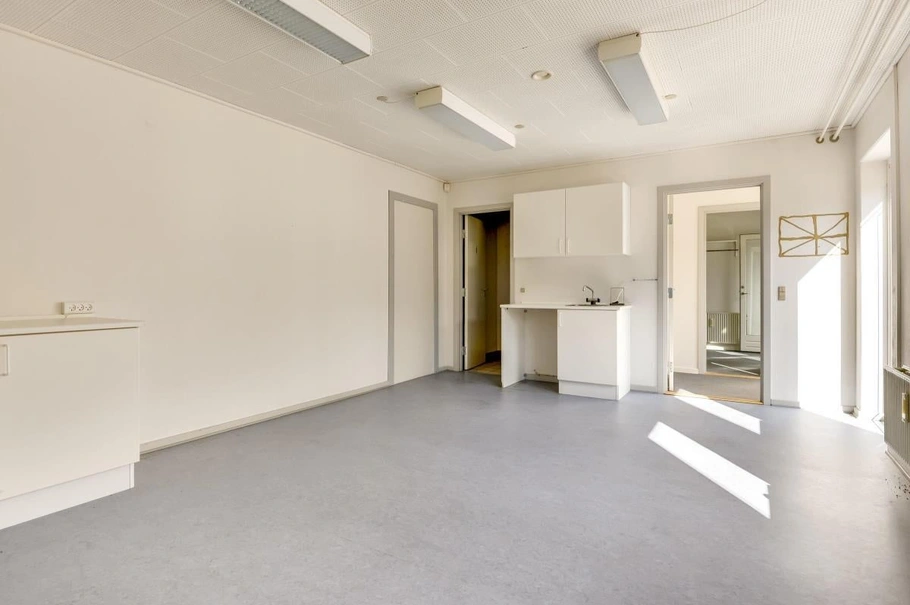 Lejemålet er beliggende på 1.sal og består af flere lokaler i forskellige størrelser med tilhørende thekøkken og toiletforhold. Lokalerne fremstår præsentable med lyse vægge og gulvtæpper. Indgang til lejemålet sker fra parkeringsareal til indgangsparti med åben trappe til 1. sal. I stueplan findes i øvrigt thekøkken, som kan anvendes til mødelokale, derudover pænt toilet.