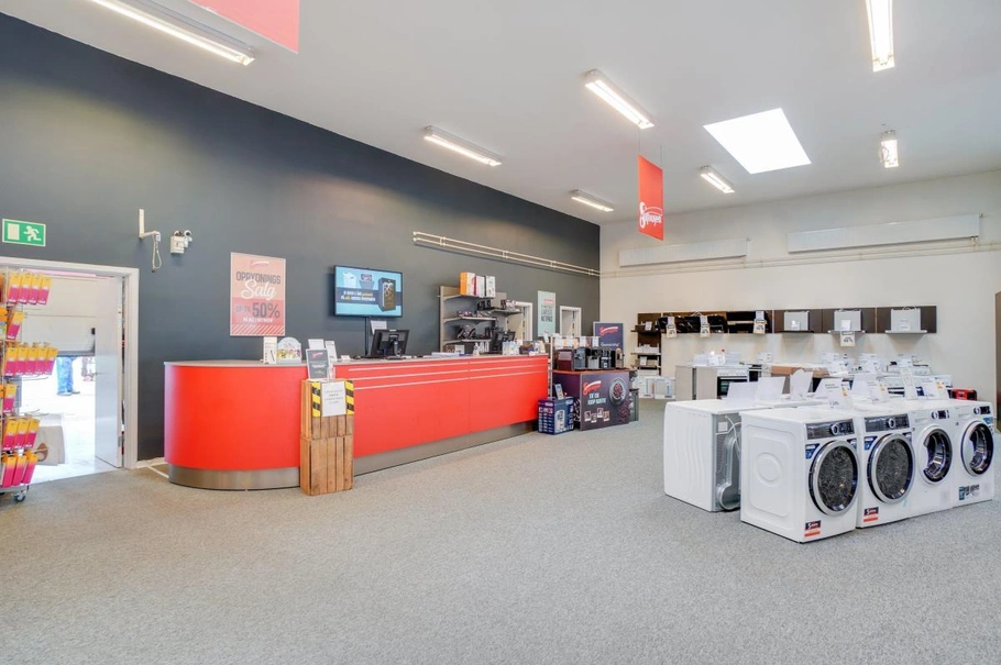 Lejemålet er indrettet med kundeindgang fra parkeringspladsen foran ejendommen via vindfang, til stort butikslokale som er med ensartet nedsænket lofter og ovenlysvinduer. Lejemålet er i dag opdelt i butik og mindre lager, adskilt af let skillevæg, den næste lejer har således mulighed for selv at ændre denne fordeling af arealet. Derudover personaleafdeling med kontor, toilet og personalerum. Der er port ind til lageret fra bagsiden af bygningen