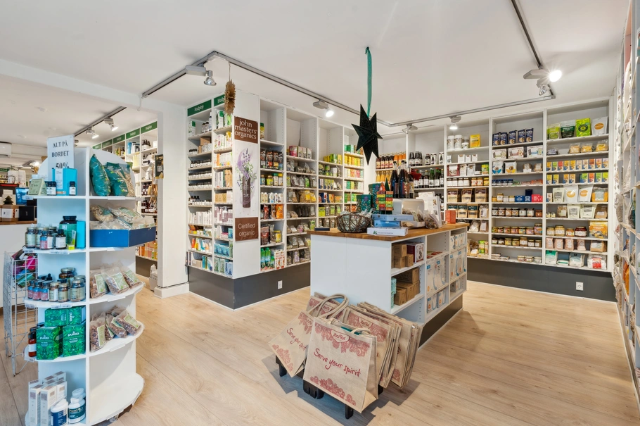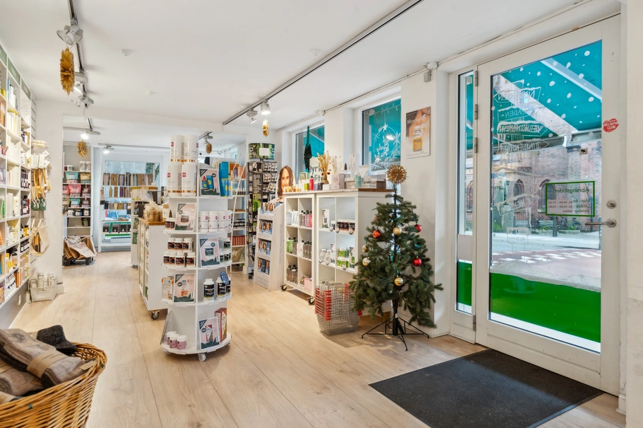 De mange udstillingsvinduer mod kirkegade giver optimale muligheder for præsentation af varer og trækker naturligt lys ind i lejemålet, hvilket skaber en indbydende atmosfære.