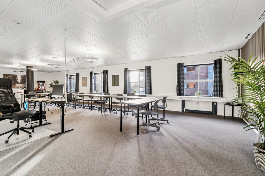 Man har adgang til lejemålet via fælles indgangsparti, hvorefter man kommer til selve kontorlejemålet der indeholder et åbent storrumskontor, 2 særskilte kontor-/mødelokaler samt toilet, køkken og printerrum. Indretningen er fleksibel, så det er muligt at indrette flere kontor/mødelokaler i lejemålet hvis man har behov for det.