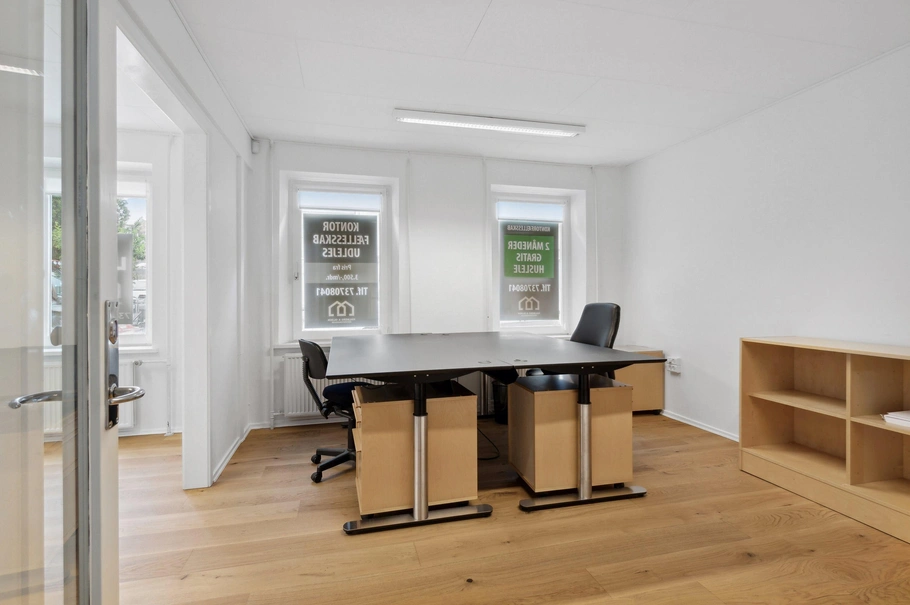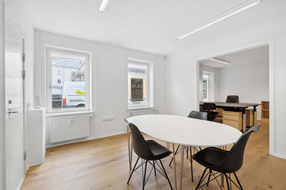 Indretningen består af entré, mellemgang med et fint lille køkken, toilet, flere lukkede kontorer/mødelokaler samt teknikrum. På 1. sal er der ét stort lokale.