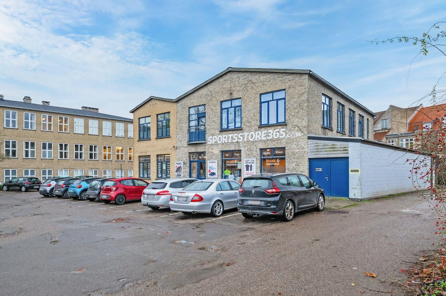 Det indeholder et meget stort salgs- og udstillingslokale med store vinduer til parkeringspladsen og indgang via 2 dobbeltdøre.