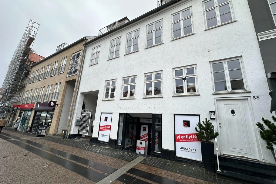 Butik midt på Ahlgade. Lejemålet er beliggende i en høj kælderlejlighed med den mest attraktive beliggenhed i Holbæk. Lejemålet er beliggende midt på byens hovedstrøg, Ahlgade med synlig facade mod gaden. Lejemålet består af et stort salgslokale på ca. 103 m² samt et toilet. Der kan let etableres en bagbutik/lager, såfremt der er behov for dette. Lejemålet er yderst velegnet til butikker med et behov for at ligge midt i Holbæks attraktive butiksmiljø. Hovedejendommen fremtræder flot og markant i bybilledet. Det bemærkes, at der er tale om en trappeleje, som over en 2 års periode vil stige til kr. 20.000 pr. måned.