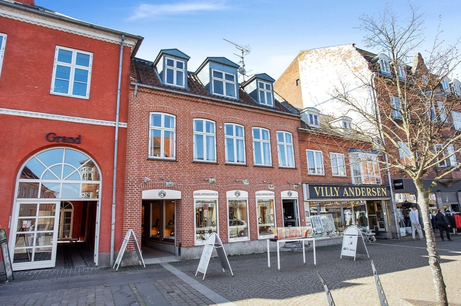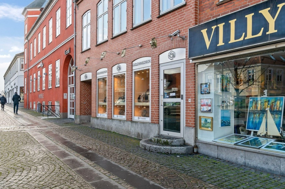 Lejemålet består I stueplan af et stort lokale på ca. 100 m², som er indrettet til guldsmedebutik og hertil kommer kælder på 62 m², der anvendes som lager for guldsmedebutikken. Herudover medfølger ca 25 m² af 1. salen, som bliver indrettet med personalerum med køkken og toilet. Det resterende areal på ca. 100 m² på 1. sal kan pt. også lejes til kontor eller evt. bolig, idet lejemålet er under omdannelse til bolig.