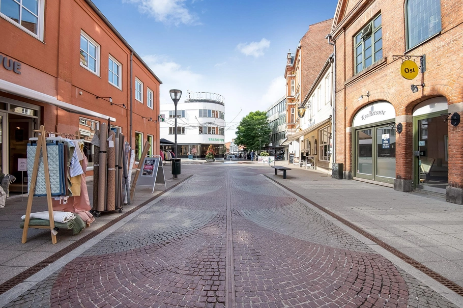 Lejemålet er beliggende lige på hjørnet for passagen der går fra parkeringspladsen ved Kvickly til gågaden, hvilket giver stor synlighed og kundestrøm.