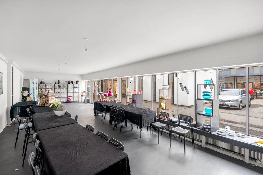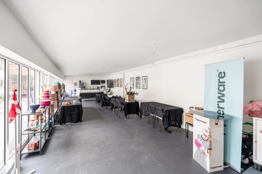 Lejemålet er indrettet som et aflangt lokale med vinduer hele vejen ned langs den ene side, hvilket giver et godt lysindfald. Lokalet er i stueplan på ca. 103 m², og fremstår indflytningsklart med en lidt rå stemning i lokalet.
