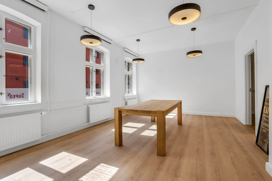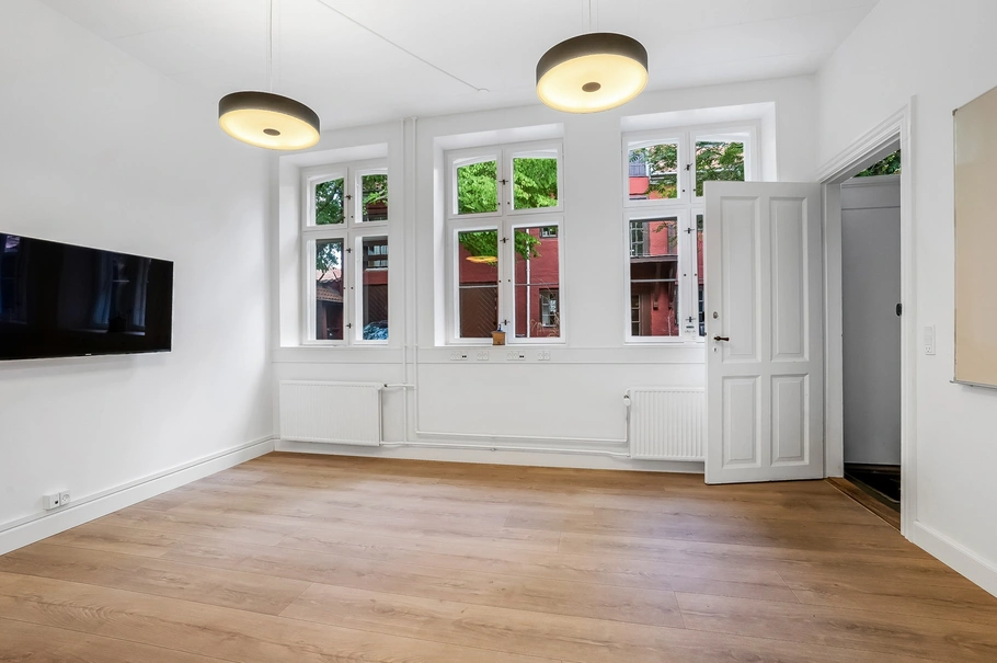 Lejemålet indeholder 112 veludnyttede m², som fordeler sig på fire lokaler, med gennemgående trægulve, to toiletter og et tekøkken.