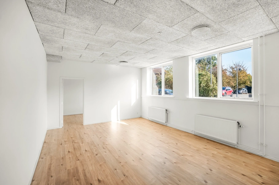 Lejemålet er indrettet med et stort åbent rum, med trægulv og troldtekt loft, som hjælper på akustikken. Herudover er der 2 ekstra rum, køkken, toilet og bad.