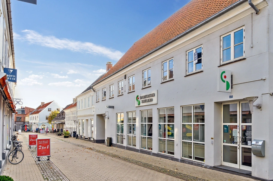 I stueetagen er Sparekassen Sjællands lokale filial, og i gården bag ejendommen er der mulighed for parkering for personale og kunder. Desuden mulighed for at leje carport.