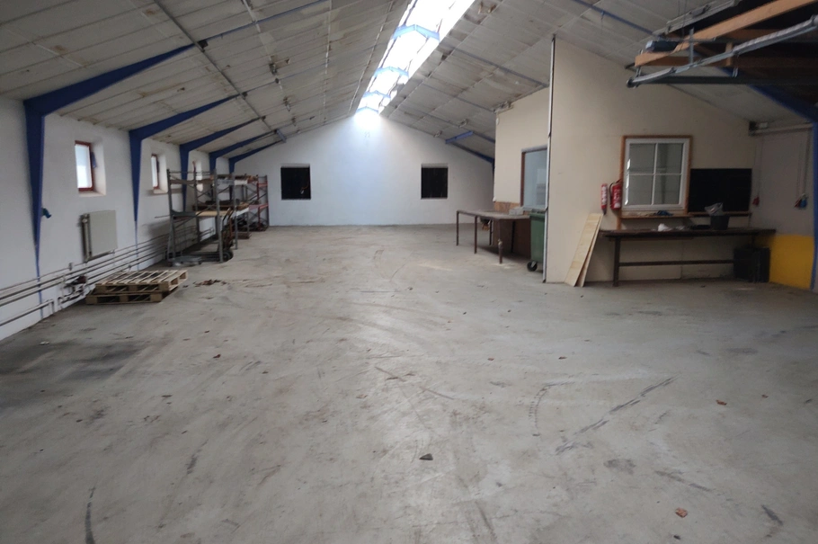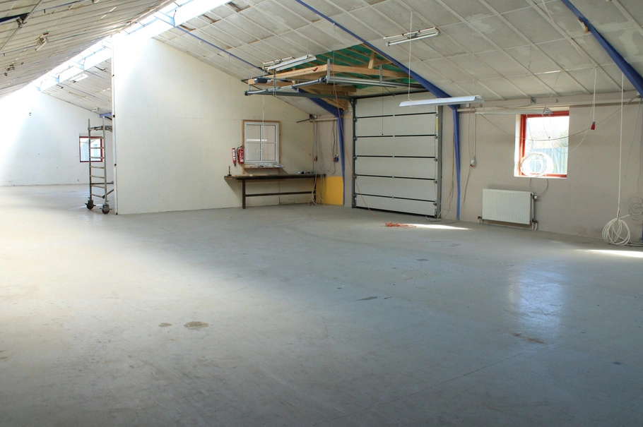 Indrettet med 376 m² produktion/lager med indbygget kontor og egen port. Kan eventuel opdeles i 2 lejemål på hhv. 178 m² og 198 m². Der er gulvvarme i lejemålet fra fjernvarmeanlæg.