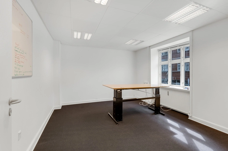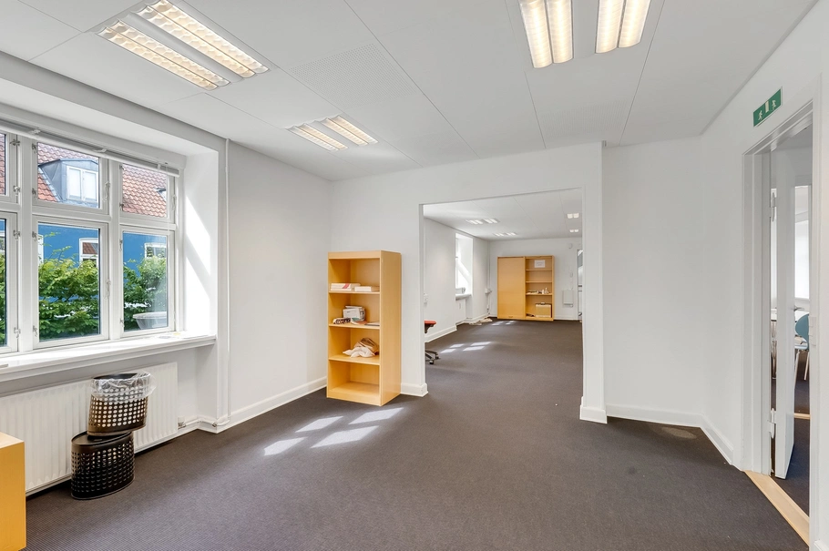 Ved indgangen til lejemålet på første sal indtræder man i flot kontormiljø med plads til 4-5 medarbejdere. Herudover indeholder lejemålet 3 kontorer/mødelokaler i forskellige størrelser, personalefaciliteter i form af køkken, toilet og badeforhold.