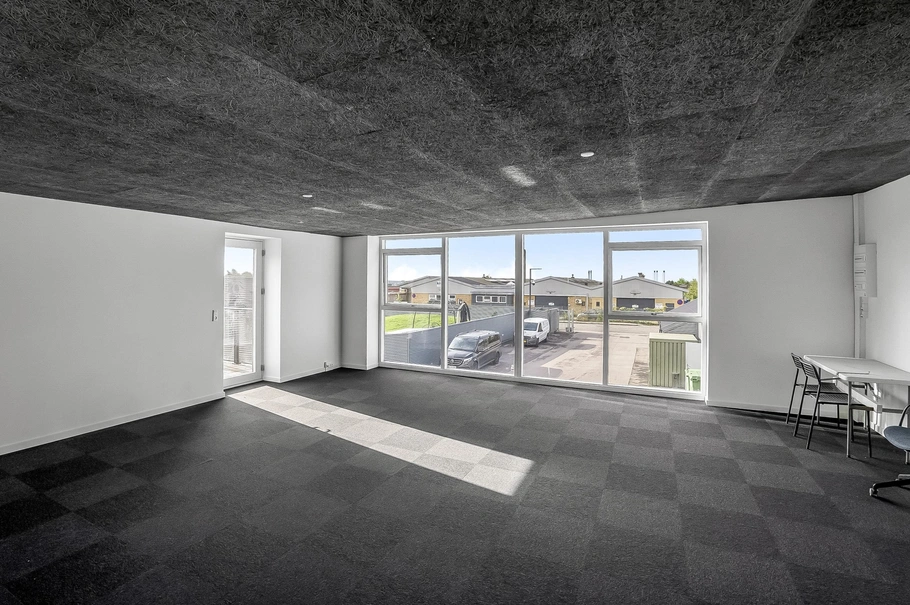 Istandsat kontor på 80 m² beliggende på 1. sal med lække tagterasse på 35 m² samt højloftet lager på 84 m² med egen port, som ligger i stueplan rundt om bygningen.