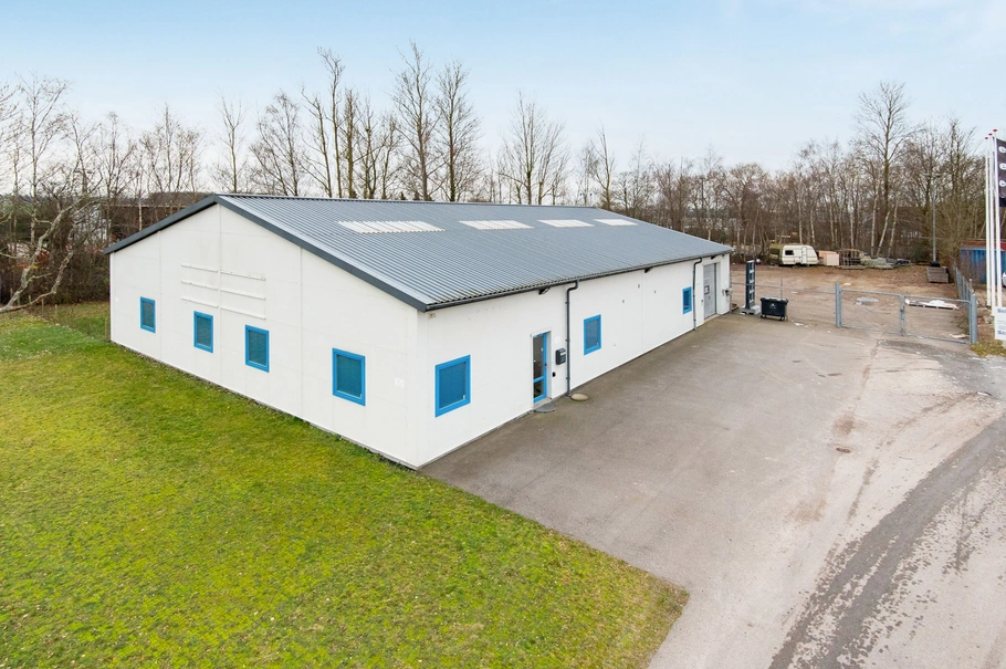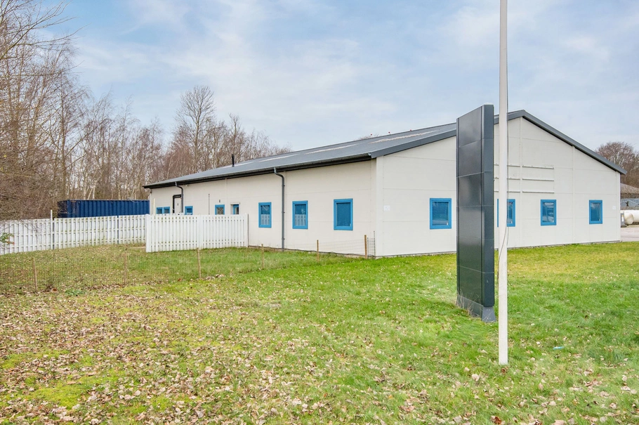 Pænt og præsentabelt lager-/kontordomicil. Ejendommens ydre, tag såvel som vægge, er opført i hvide metalplader.