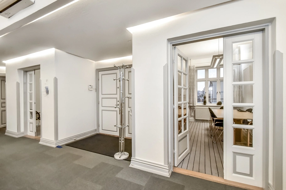 I midten af lejemålet ankommer man til receptionsområdet, hvorfra man kan tilgå de forskellige kontorer. Lejemålet består af en blanding af åbne kontorlandskaber og mindre kontorer. Lejemålet har adgang til to altaner. Endvidere kan der være mulighed for at etablerer tagterrasse.