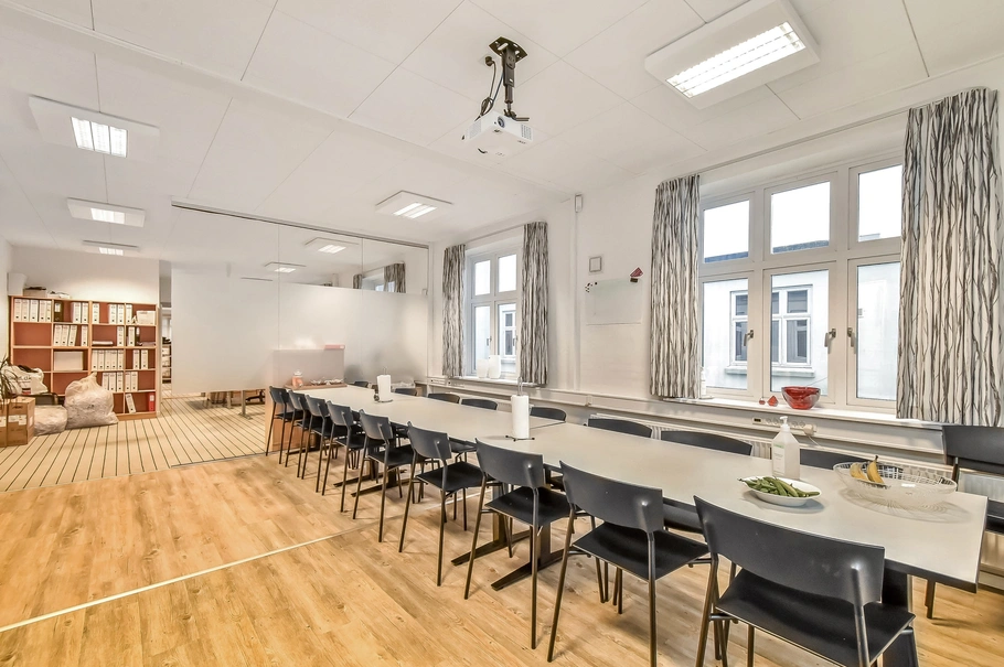 Via en særskilt trappeopgang til lejemålet er der adgang til et åbent kontorlandskab, frokostrum med tekøkken og et toilet. Der vil være mulighed for at ændre den nuværende rumopdeling, som består af en glasvæg.