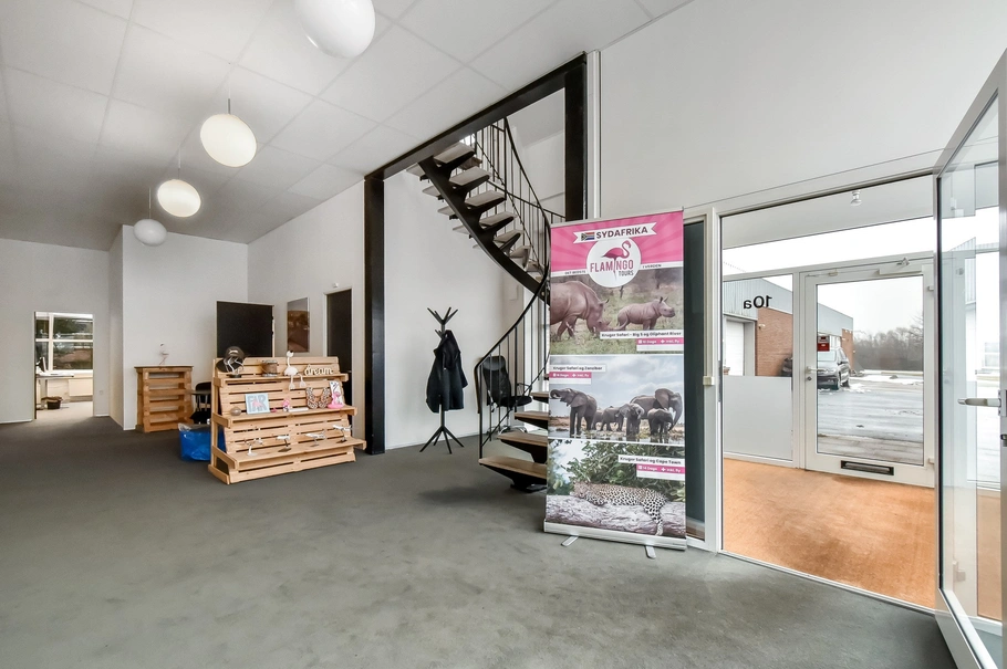 Lejemålet er indrettet med vindfang samt kontor- og administrationslokaler fordelt i 2 plan. Stueplan er indrettet med åbent kontormiljø med mulighed for at etablering af receptions/-velkomstområde, depotrum, 2 toiletter, frokostrum med tilhørende lyst the-køkken. Hertil kommer stort åbent kontor/mødelokale samt udgang til gårdhave, der kan nydes i de lunere tider.