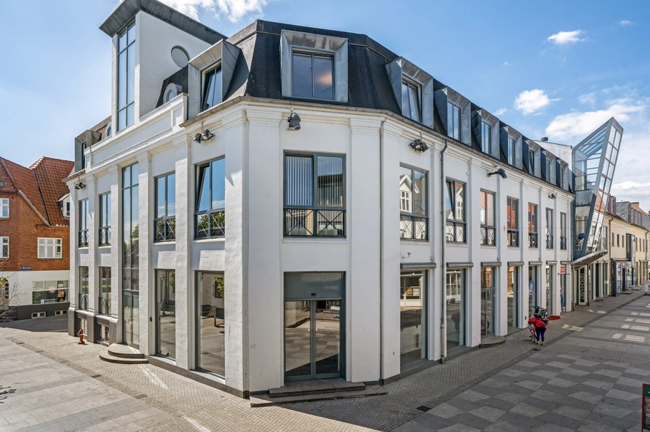 Lyst og hyggeligt butikslejemål i Færch-Huset beliggende som hjørnelejemål med flere facadevinduer med gode udstillingsmuligheder mod Østergade og Skovgyden.