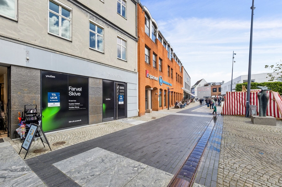 Naboer: varieret udbud af detailbutikker mv. i området. Nabo til Spar Nord, Skive Folkeblad, Helm lædervarer og tasker.